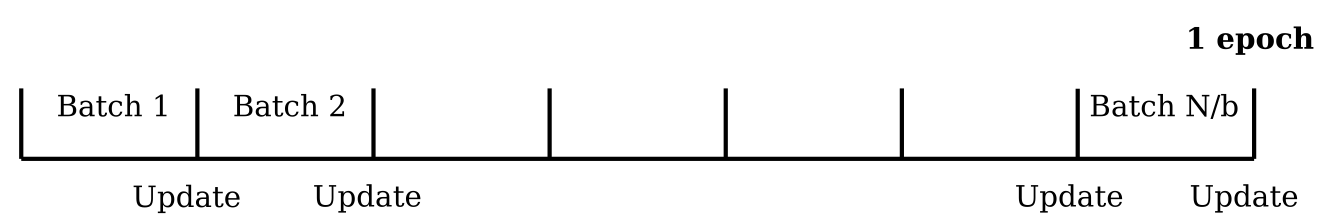 Advice & Possible pitfalls: It is generally a good practice to make b large as to include enough statistics for the training within an update. This can contribute to have a training/validation curve which is more stable, ie. with less fluctuations. On the other hand, if \(b\) is so large as to match the size of the training sample \(N\), there will be only one update in the training, as all data will be used to train the NN at once: this can be time consuming, and quite inefficient.