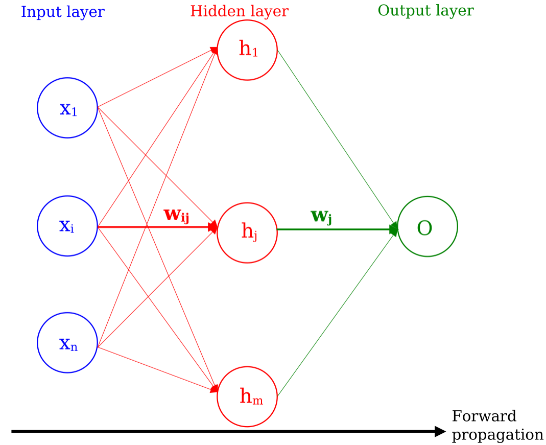 In a NN, the information of the \(n\) input variables \(x_i\) is propagated to different nodes as illustrated in figure 1, where we represent a NN with one hidden layer of \(m\) nodes. The information is propagated from the input nodes to the output node(s) via the hidden layer(s), representing the foward propagation of the NN. In this example, there is only output node. In the case of a multi-class NN, there is as much nodes as classes for classification.