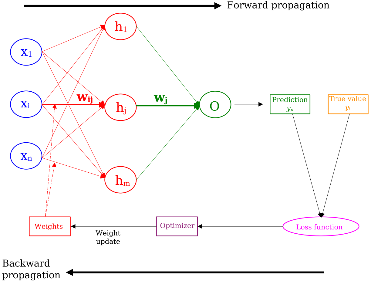 The NN is trained iteratively on the (training) data to adjust the weights, aiming to find their optimal values that minimize the loss, ie. minimize the difference between its predictions and the true values. This is done in the backward propagation step of the training, as illustrated in the figure below. The full iteration of a forward- & backward-propagation is called an epoch, ie. epoch in the training of the NN.